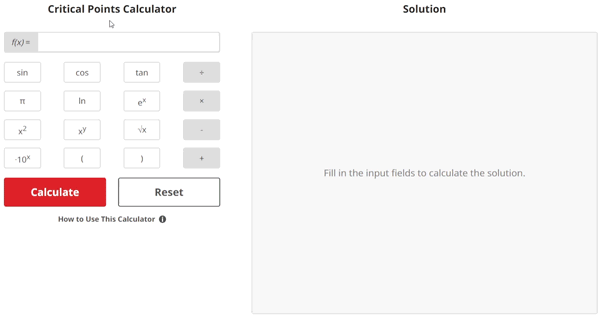 The Critical Points Calculator was developed using HTML, CSS, and JavaScript. The HTML portion of the code creates the framework of the calculator. This framework designates various important entities such as the calculator space itself, answer box, and the solution box.