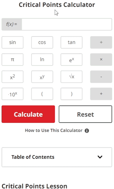 The Critical Points Calculator was developed using HTML, CSS, and JavaScript. The HTML portion of the code creates the framework of the calculator. This framework designates various important entities such as the calculator space itself, answer box, and the solution box.