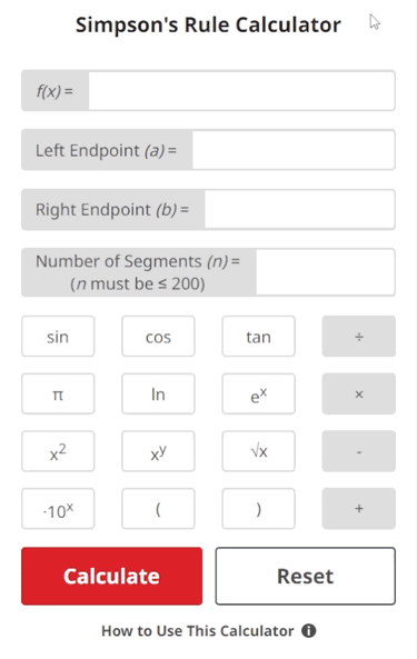 $$\begin{align}& \text{1.) }Area = \frac{\Delta x}{3} [f(a) + 4f(a + \Delta x) + 2f(a + 2 \Delta x) + \cdots \\ \\ & \hspace{3ex} \cdots + 2f(a + (n-2) \Delta x) + 4f(a + (n-1) \Delta x) + f(b)] \\ \\ & \hspace{3ex} \text{2.) } \Delta x = \frac{b-a}{n} \end{align}$$